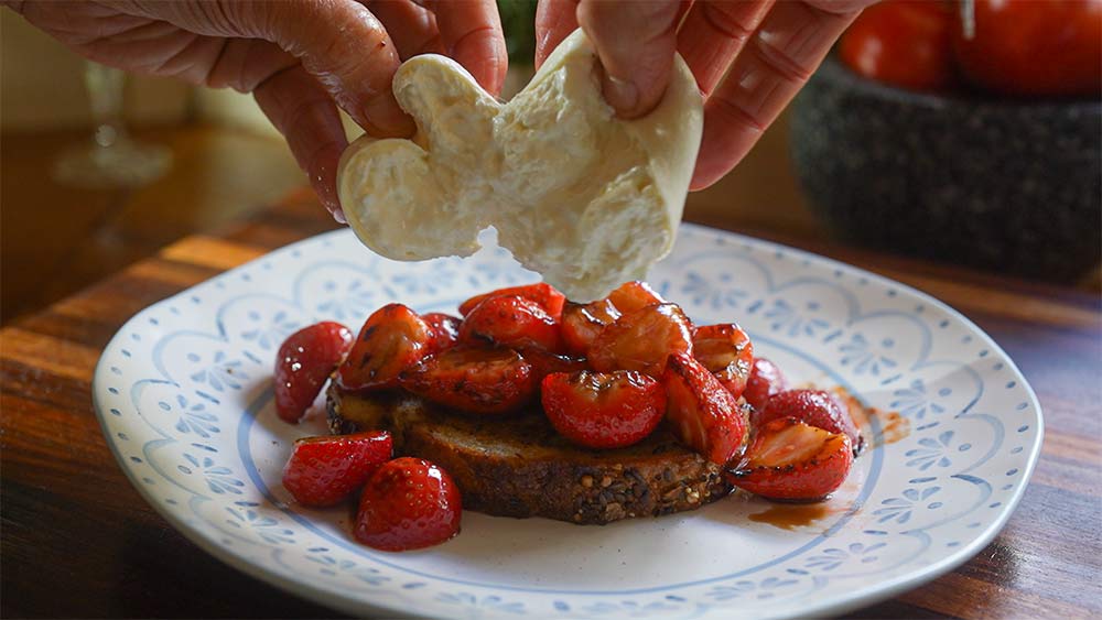 The strawberries go in and soften just enough to change. The edges catch, turn a little jammy, a little smoky, and suddenly they’re sweeter, deeper, more interesting than they were raw.