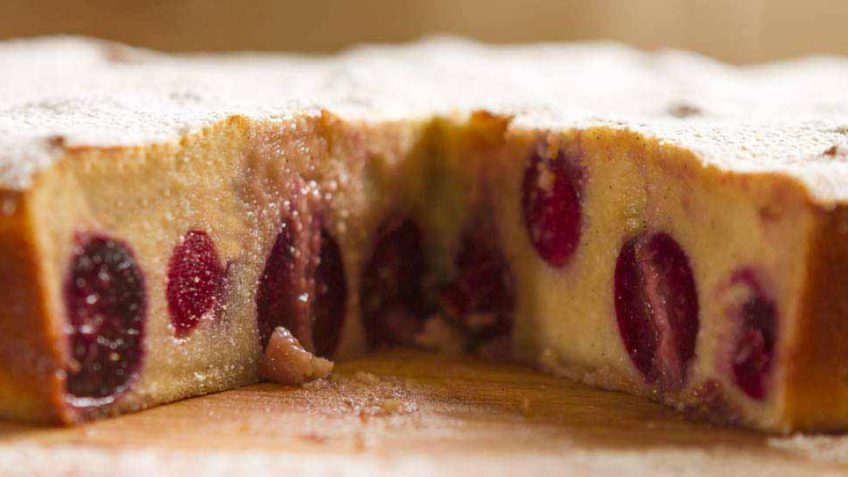 A clafoutis is a baked French dessert from Limousin that was traditionally made with black cherries. The cherries are arranged in a lined mould, enough to cover the whole bottom of the dish and then a custard like batter is poured over the cherries, then baked. The traditional clafoutis uses whole cherries with the pits giving an additional flavour. The pits have to be spat out which can be annoying for most, otherwise feel free to leave them in for a better authentic clafoutis flavour.