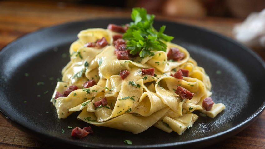 Creamy Garlic Pasta with Crispy Salami is a delicious and easy pasta dish that is perfect for a quick weeknight meal. I used fresh pasta for this recipe, you can of course also used dry. The pasta is cooked al dente and then tossed in a creamy sauce made with garlic, chicken stock, cream, and Parmesan cheese.