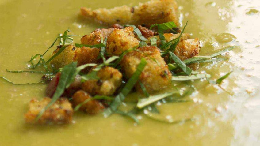 Vendors in the streets of Athens were selling hot pea soup five hundred years before Christ. This version is rustic as there’s no blending involved, the pea texture remains along with fall apart chunks of smoked ham hock. Add fried crispy croûtons for crunch and fresh mint garnish for freshness.