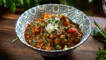 Harissa-Spiced Chickpea & Chicken Stew. A smoky North African, inspired one-pot wonder packed with a blend of spice, tender chicken, sweet veg, and creamy chickpeas. Finished with cooling yogurt and
