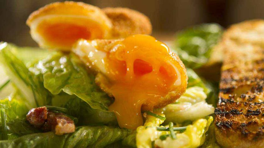 Salade lyonnaise is traditionally made with bitter curly leaf lettuce and a poached egg. It’s a dish very similar to the ever famous Caesar Salad. My version is a twist on the original Lyonnaise using baby romaine or cos lettuce and a crispy fried egg. Frying the egg is an extra step, but it’s not difficult and really brings this salad to a whole new level. The heat from the bacon, the hot charred toast and the deep fried egg turns this into a sensational warm salad. A perfect lunch with an explosion of flavours.
